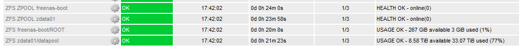 Checks ZFS health and available disk space using SNMP V2 Specify a 'zpool' and 'dataset' to check, health mode is for zpools only. Handles TrueNAS SNMP OID's a bit better than 'check_smtp' by using 'OID.Index'. The check is meant to be used with multiple service defines in a nagios host cfg. See Example below. Options can also be set as variables in the script itself (instead of using args). Tested with TrueNAS CORE 12.0 U2 and 13.0-U4, should work with zVault (untested)